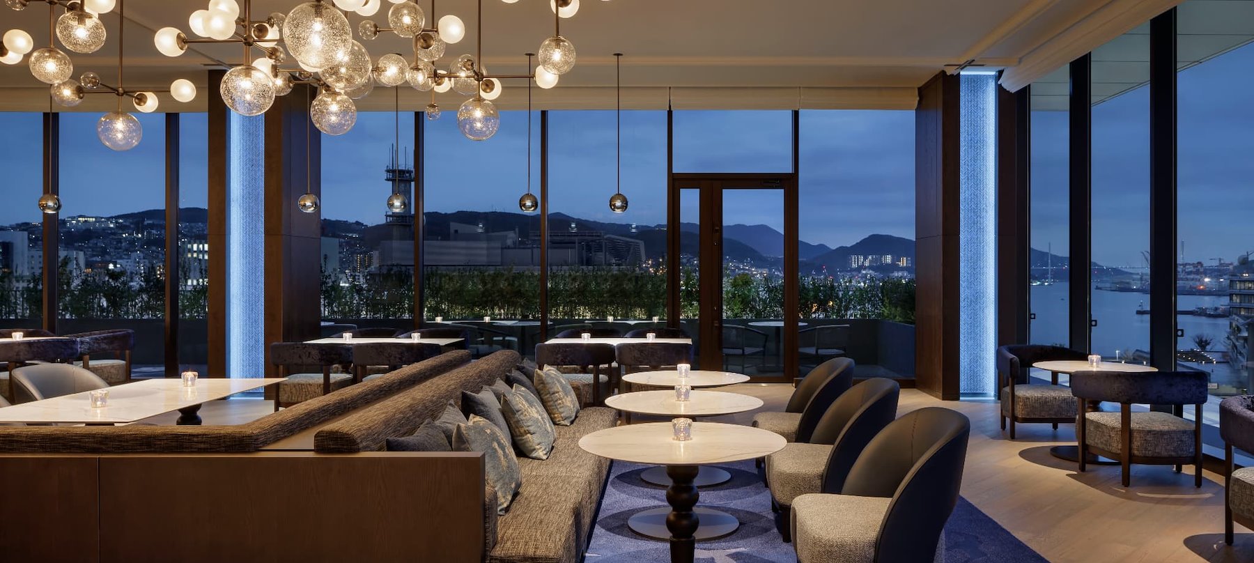 As night falls, pendant lights reflected in the glass shimmer like stars dancing across the evening sky.